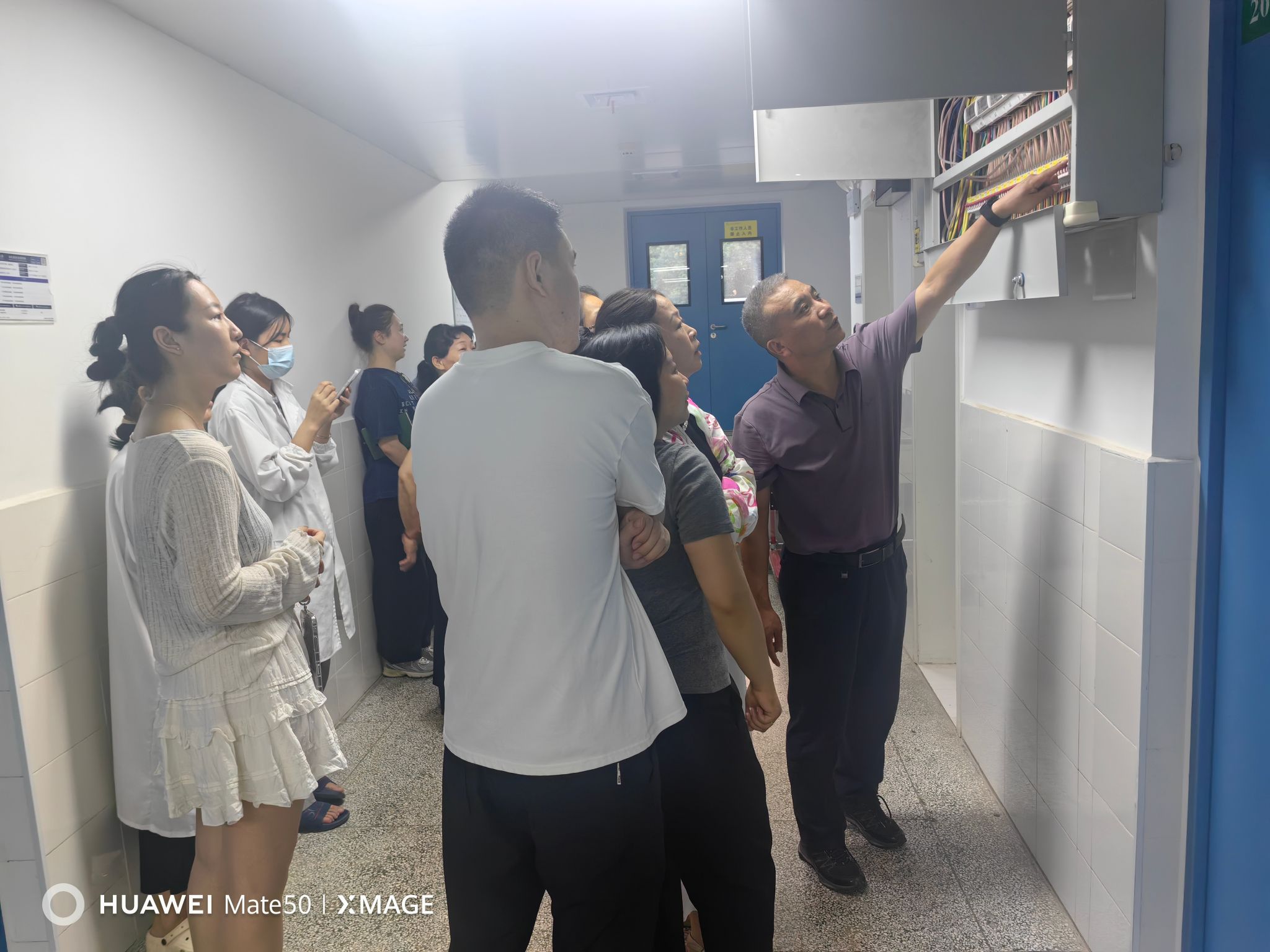 理论学习结束后,贺老师带领全体参训人员深入实验区域,开展现场实操教学。在一区、二区实验室,他逐一演示了配电箱安全操作、紧急断电装置使用、水管阀门启闭规范等核心技能。